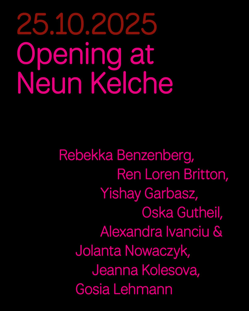 Artists: Rebekka Benzenberg, Ren Loren Britton, Melo Börner, Yishay Garbasz, Oska Gutheil, Alexandra Ivanciu & Jolanta Nowaczyk, Jeanna Kolesova, Gosia Lehmann, Lillian Morrissey, Kaj Osteroth, Mila Panic, Marta Popivoda, Alicja Rogalska, Maria Thrän, Ana de Almeida, Vanja Smiljanić