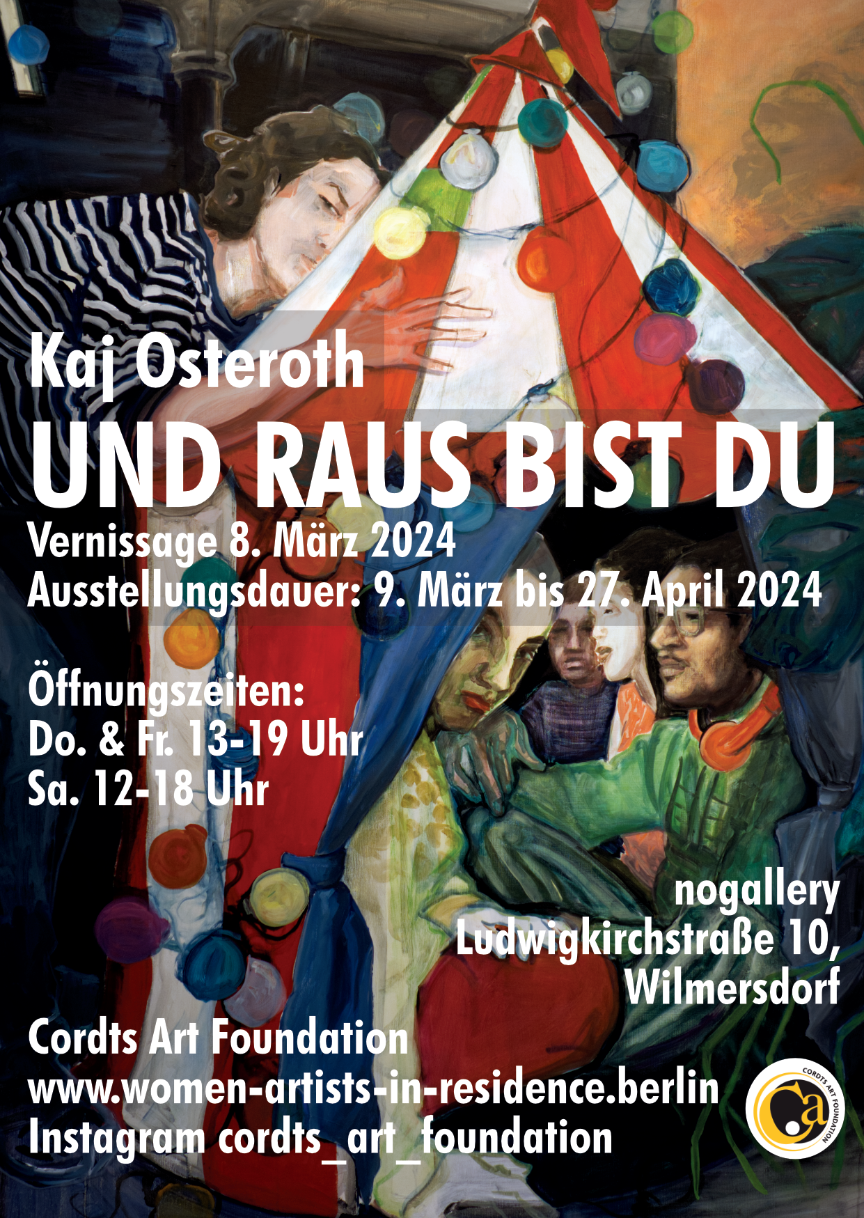 In Kaj Osteroths Welt steht der Titel gebende Reim „Und raus bist du“ für das Gefühl, das sie insbesondere mit ihrem Umzug nach Brandenburg begleitet hat und das als Selbstreflektion in einer Vielzahl der hier ausgestellten Arbeiten auftaucht. Die Kunstwerke präsentieren Momentaufnahmen von einem scheinbar unbeachteten Fleck der Welt, einem Ort, geprägt von industrieller Ausbeutung, struktureller Verwahrlosung und dem Gefühl des Abgehängtseins. Dieser Realität versucht die Künstlerin in ihren Arbeiten zu begegnen und sie für sich fruchtbar zu machen, indem sie die hier gefundenen und erfahrenen Perspektiven, Lebenswelten und Geschichten in ihren Bildern sichtbar macht und